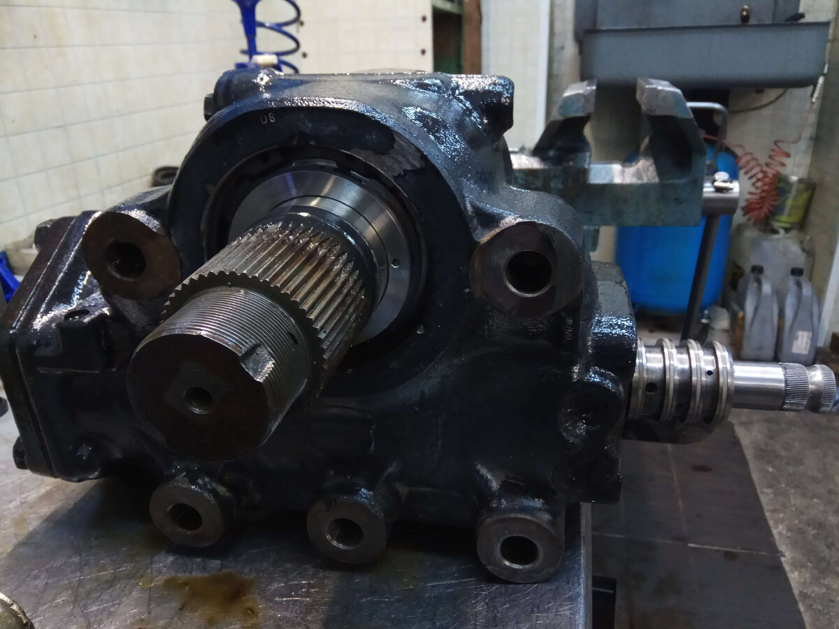 Редуктор устроен достаточно просто. Массивный корпус, который должен выдерживать нагрузку передачи усилия на тяжелые колеса грузового автомобиля в максимальной загрузке. Первичный вал, на который через карданчик передаётся вращение рулевого колеса. Золотник и поршень, призванные с помощью давления масла снизить усилие на руле. Вал сошки и его зубчатый сектор - превращают вращение первичного вала в поступательное движение рулевых тяг в итоге. В целом, простое устройство из достаточно массивных и надежных деталей.