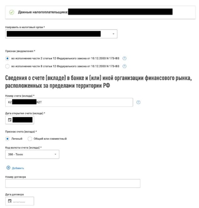 «Счета в банках за пределами РФ» -> «Уведомить об открытии счета …»