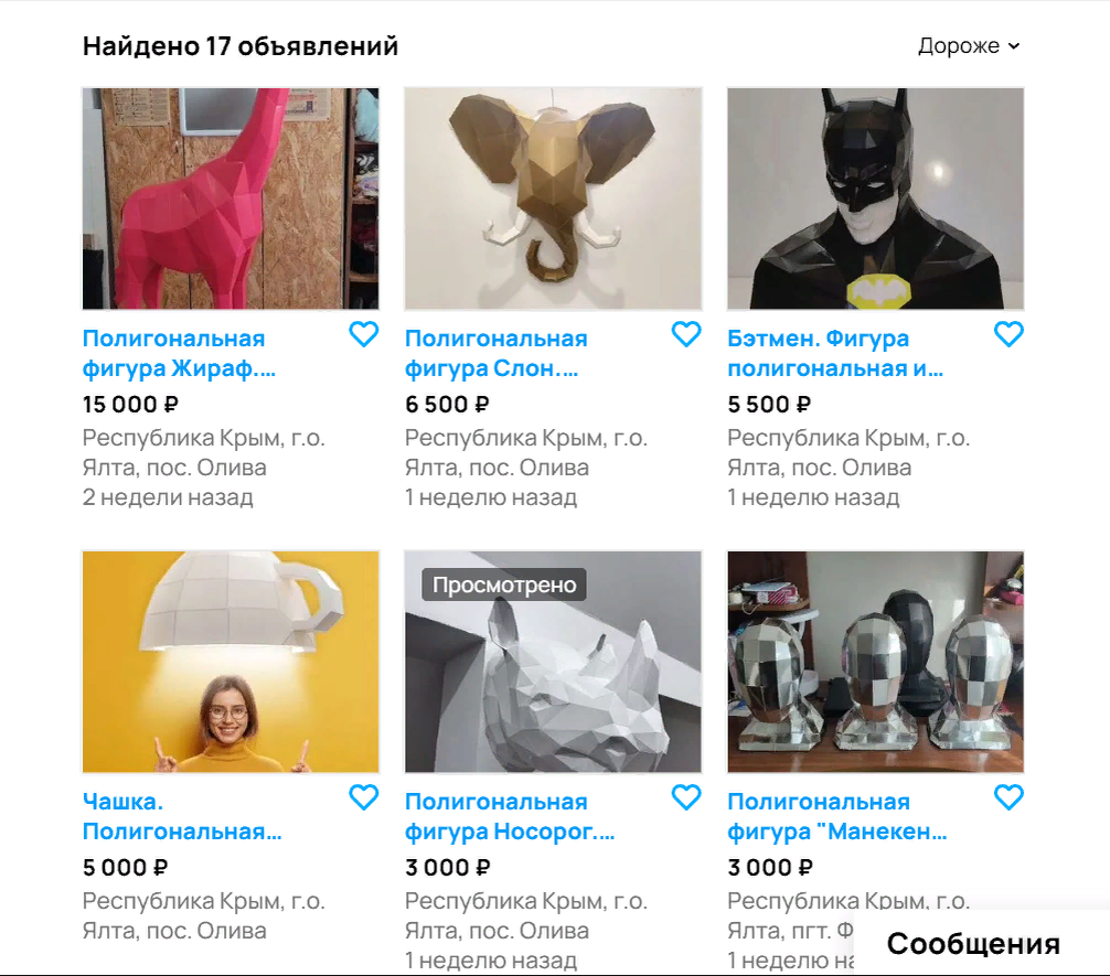 Сегодня в сети интернет можно найти множество предложений о покупке полигональной фигуры из бумаги. Стоимость таких фигур может достигать нескольких тысяч рублей в зависимости от сложности и размера фигуры. Где купить полигональную фигуру из бумаги? Несмотря на то, что на сайте "Полигонии" сейчас готовые фигуры из бумаги не представлены, некоторые из них размещены в продаже на сайте Авито. Связано это с тем, что у единственного автора сайта и фигур сейчас не хватает средств на активную рекламу, а сами полигональные фигуры из бумаги - это специфический вид декора, который скорее всего станут искать на сайтах, где можно найти всё. У "Полигонии" есть аккаунт на Авито, где размещены полигональные фигуры из бумаги и наборы для творчества. Что с доставкой? Так как автор и фигуры находятся в большом отдалении от городов и мегаполисов с развитой системой доставки, а фигуры являются предметами хрупкими и крупногабаритными, существует всего несколько экономически выгодных и оправданных способов
