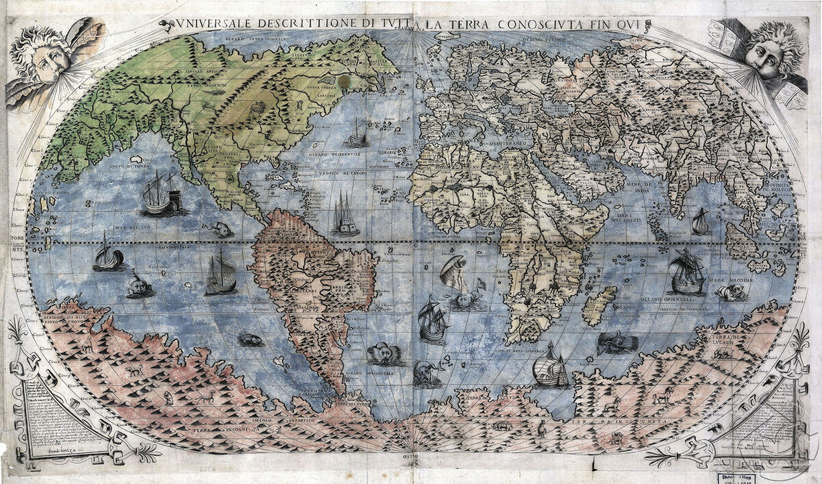 Историческая наука на древние карты, как на источники смотрит без доверия. Объяснения простые: в то время картография находилась в зачаточном состоянии, никто не умел точно определять долготу и, соответственно, определять местонахождение. Для определения долготы требуются достаточно точные часы. Считается, что долготу начали точно определять лишь в XVIII веке с появлением точных хронометров. На этот фактор еще можно отнести неправильные формы и очертания материков на древних картах. Но как быть с тем, что многие материки имеют совсем иную географию? Например, Евразия и Северная Америка – это единый материк. Присутствует Антарктида без льдов и т.д. На северном полюсе четыре огромных острова или какой-то материк и т.д. Приведу несколько примеров древних карт эпохи Возрождения (XIV-XVI вв.). Возрождения чего и после чего – неизвестно, но история говорит, что эпоха Возрождения - это только про культуру. Первая интересная карта – это карта мира 1565 года венецианского картографа Феррандо Бе