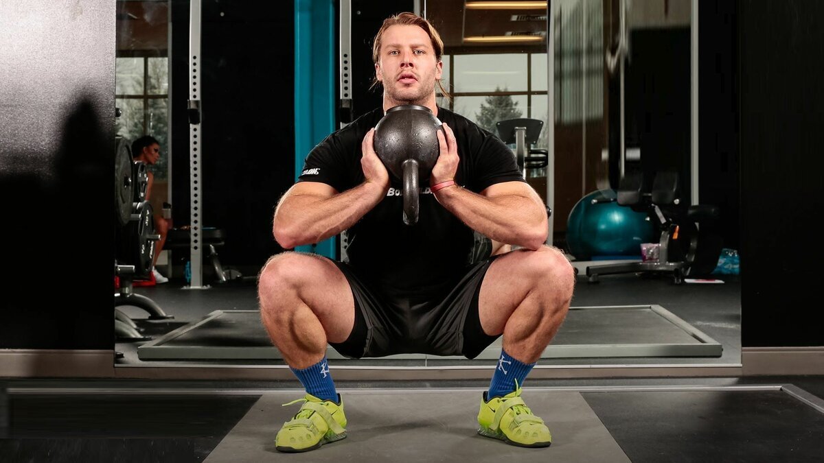 - Глубина приседаний определяется уровнем физической подготовки атлета. Новичкам можно выполнять неглубокие приседы с гирей, а продвинутым спортсменам рекомендуется опускать таз до параллели бедер с поверхностью пола.