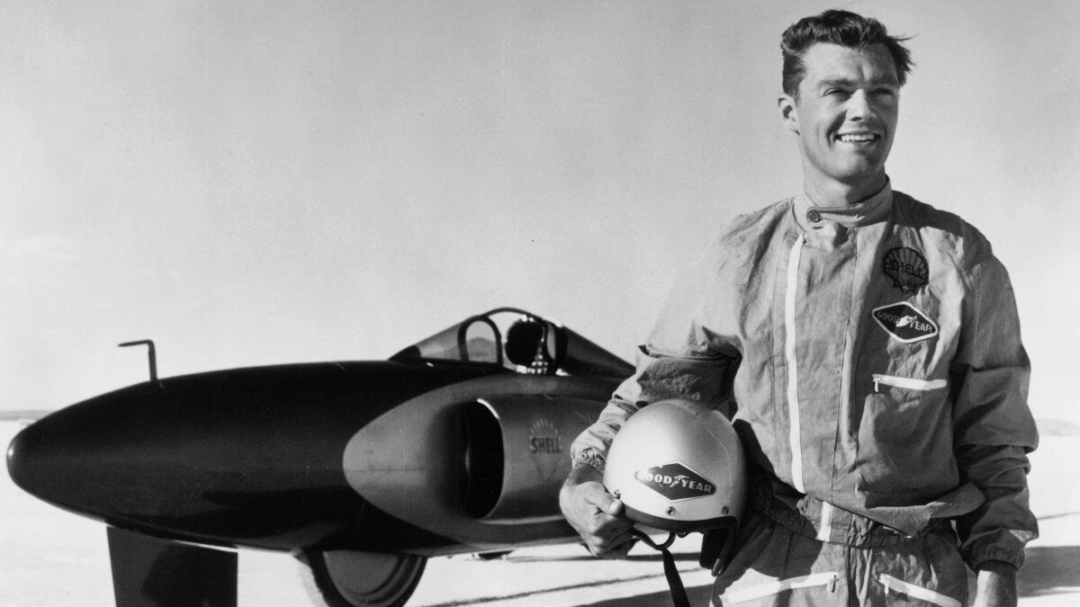 В первой жизни он и впрямь был самолетом. Его звали F-86 Sabre – один из первых реактивных истребителей в мире. Воевал с советскими Миг-15 в небе над Кореей. Затем оперение «Сейбра» пригодилось для рекордного автомобиля. На Spirit of America, оснащенном еще и турбореактивным двигателем General Electric J47 – собственно тоже «сейбровский» мотор – Крейг Бридлав установил несколько абсолютных рекордов скорости. На поверхности высохшего соляного озера Бонневиль в Юте – настоящей Мекке драгстеров и хот-родов – Бридлав преодолел барьер в 400, а затем и 500 миль в час. Соответственно в сентябре 1963-го и октябре 1964-го. Ну а затем в попытке проехать еще быстрее «шит» все-таки случился. Отказали – тупо оторвались – тормозные парашюты и машина Бридлава… установила рекорд, который возможно никогда не будет побит. Это самые длинные в мире следы торможения – около восьми километров.