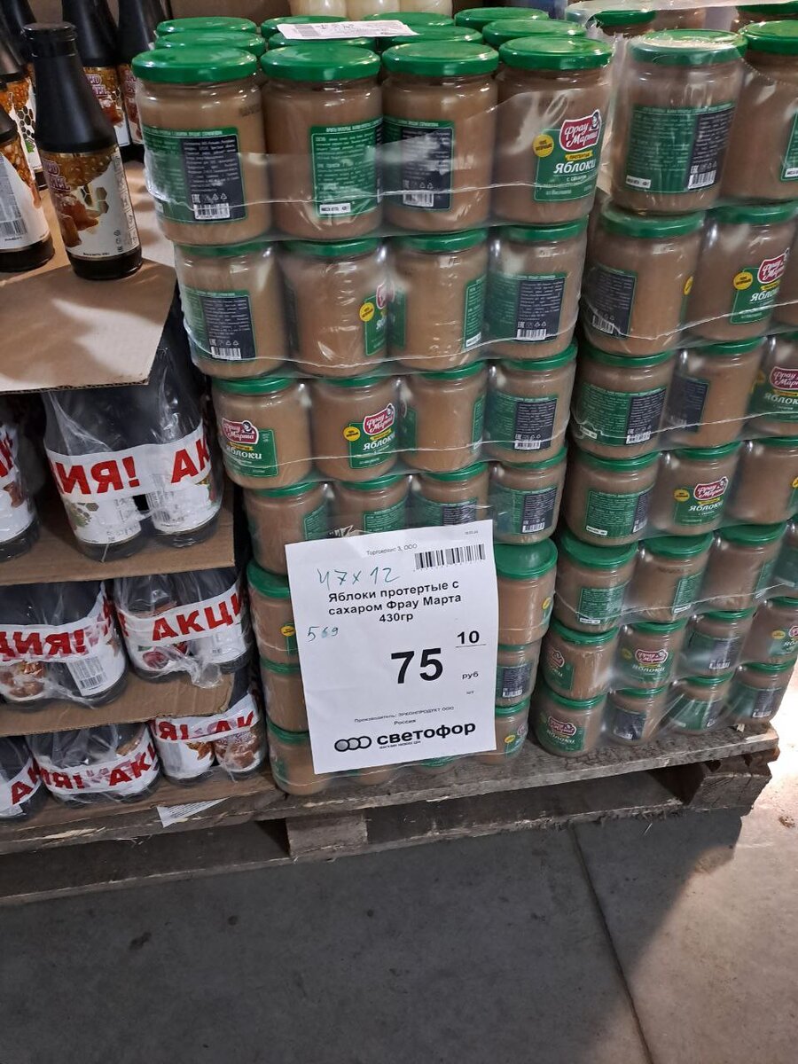 Были в воскресенье с недельной закупкой в магазине Светофор.Есть уже проверенные товары, которые с уверенностью беру, знаю что хорошего качества, новинки тоже иногда покупаем, но внимательно смотрим на состав. Что беру часто: крупы, проверенных марок сыры и майонез, фрукты и овощи, яблочные пюре, некоторые виды конфет и печенья, проверенные марки консервированного горошка, кукурузы, шампиньонов, персиков и абрикосов, джемы. Регулярно беру индейку (всегда хорошая: что филе, что бедро). В обзоре покажу, что покупаем в Светофоре постоянно и что купила бы сама. Яблоки протёртые с сахаром за 75 руб. за 430 г. (купила попробовать думаю на вкус как детское пюре будет, а его мы покупаем часто). Вот такой сироп “Карамель”, который можно добавлять в блинчики, в молочные коктейли -160 руб. Оливковое масло по 166 за пол-литра. Давно не привозили Манго -цукаты 500 г за 193 руб. Вишневый джем. Молоко сгущенное в пластиковых банках Если есть хорошие фрукты, то берём. Груши по 145 руб Гранат за 12