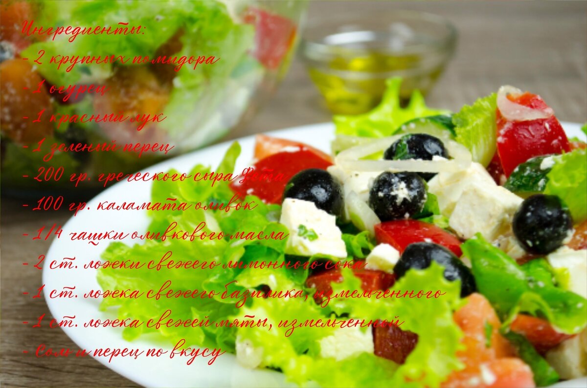 Заглянув в глубокую историю Греции, мы обнаружим не только великолепные архитектурные памятники и богатое наследие, но и разнообразную и вкусную кухню. Одним из самых известных блюд, которое приходит на ум при упоминании греческой кухни, является легендарный Греческий салат. Свежий, ароматный и богатый витаминами, он становится источником вдохновения для многих любителей кулинарии. Давайте попробуем воссоздать в домашних условиях этот неповторимый деликатес с помощью нашего простого, но уникального рецепта. Ингредиенты: - 2 крупных помидора - 1 огурец - 1 красный лук - 1 зеленый перец - 200 гр. греческого сыра Фета - 100 гр. оливок - 1/4 чашки оливкового масла - 2 ст. ложки свежего лимонного сока - 1 ст. ложка свежего базилика, измельченного - 1 ст. ложка свежей мяты, измельченной - Соль и перец по вкусу Приготовление: 1. Помидоры нарезаем на кубики, огурец — на полукольца, красный лук — на тонкие полукольца, а зеленый перец — на кусочки. Смешиваем все эти ингредиенты в большой миск