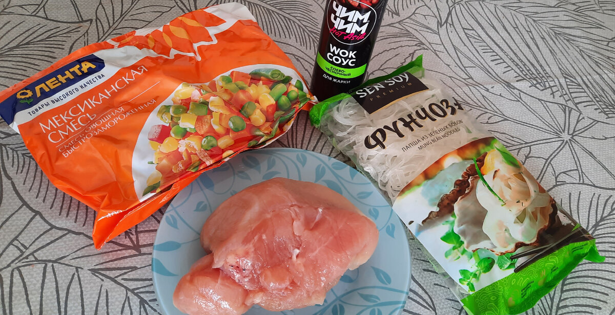 Когда мне нужно приготовить полноценный обед за пол часа, меня спасает этот рецепт! Да да, вы не ослышались, всего 30 минут и горячий вкусный обед уже у нас на столе. Ингредиенты: Приступаем к приготовлению! Этап 1. Нарезаем куриную грудку кубиком и отправляем на разогретую сковороду с маслом. Обжариваем до золотистой корочки на сильном огне около 5-7 минут до золотистой корочки. Далее добаляем соево-чесночный соус. Я добавляю примерно 2-3 ст.л. Обжариваем 1-2 минуты. Этап 1 и 3 выполняем одновременно Этап 2. После этого добавляем нашу мексиканскую смесь и все специи. Тчательно перемешиваем и обжариваем около 7-10 минут до готовности овощей. Этап 3. Одновременно с этапом 1 ставим на плиту кастрюлю с подсоленой водой. После закипания закидываем нашу фунчозу в воду и варим 12 минут на среднем огне. По истечении времени сбрасываем лапшу на друшлаг и промываем холодной водой. Я люблю использовать толстую фунчозу, её необходимо варить. Если вы используете тонкую, то её просто необходимо за