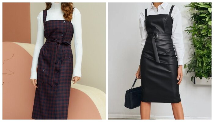 Самые актуальные, современные и трендовые модели сарафанов в деловом стиле - как и с чем их стоит носить. Твидовые, полосатые, клетчатые, кожаные, однотонные, а также модели украшенные женственной вышивкой - все эти сарафаны достойны вашего внимания в этом году. Гармоничный образ, который включает в себя белую оверсайз футболку, полосатый сарафан в деловом стиле, бежевое пальто, а также массивную цепочку. Следующее удачное сочетание для бизнес леди: женственная блуза с пышными рукавами и оборками + сарафан в деловом стиле. Темные оттенки сарафанов выигрышно контрастируют на фоне белоснежных блузок. В качестве дополнительных ярких акцентов к данному сочетанию вещей можно смело добавить пеструю модель клатча или сумки. Для повседневных стильных аутфитов трендовые модели строгих сарафанов стилисты предлагают нам носить в одном тандеме с однотонными черными водолазками. Следующий сарафан макси в деловом стиле шикарно смотрится с вязаным свитером легкого оверсайз размера, а также шляпой с
