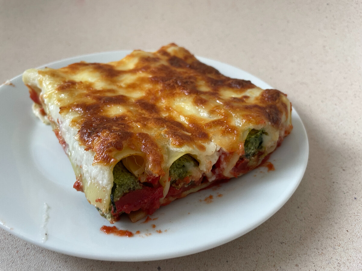 Нежнейшие каннеллони со шпинатом и рикоттой - отличное угощение для любимых. Ингредиенты: Ход приготовления: На 100 граммах сливочного масла обжарить шпинат. Добавить сыр рикотта и влить сливки. Протушить 5-7 минут. Если листья шпината крупные пробейте в блендере и оставьте остывать На дно формы для запекания вылейте томатный соус. Купите готовый или измельчите погружным блендером резанные томаты в собственном соку Каннеллони - это такие большие макароны трубочки. Их не нужно предварительно отваривать Начиняем шпинатной начинкой трубочки при помощи кондитерского мешка. Или можно использовать пакет, отрезав уголок Выкладываем начиненные трубочки на соус Готовим соус бешамель. На дне сотейника или маленькой кастрюльки растапливаем сливочное масло (50 гр.) и всыпаем муку. Непрерывно помешиваем венчиком. Далее вливаем молоко (300 мл.) Соус должен получиться более жидким, чем для лазаньи Поливаем соусом каннеллони Сыр моцарелла (для пиццы) натираем на крупной терке и посыпаем блюдо сверх