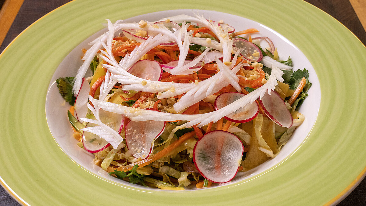 Жареный соленый арахис - 1 ст. ложка Приготовление: Манго очищаем от кожицы и нарезаем тонкой соломкой. Также соломкой режем зеленый лук, огурец и чили перец. Тонкими слайсами нарезаем редиску, красный лук и на терке для корейской моркови натираем морковь. Шинкуем кинзу и режем соломкой китайскую капусту. Приступим к заправке. В миску отправляем соевый соус, шрирачу, кунжутное масло, выдавливаем из кусочка лимона сок. Добавляем сахар и перетертый в пасту зубчик чеснока. Все перемешиваем до полного растворения сахара. Соеди