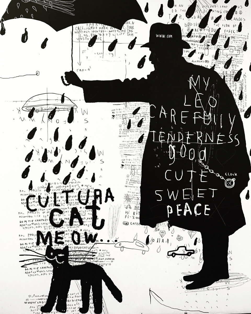 На первый взгляд этот рисунок не кажется дурацким. Тут человек совершает добрый, вроде бы, поступок, спасает Кошку от дождя, и все исписано аглицкими словами. И все бы ничего, и слова хорошие, и даже смысл какой-никакой можно отыскать, если хорошенько покопаться, но вся благая задумка спотыкается и рушится, превращаясь в глупость и абсурд, когда узнаешь, что это изображение встретилось мне на фасаде одного из домов в славном, древнем русском городе Коломна. С какой целью в Коломне писать слова на английском на стенах домов? Почему не на русском? Откуда вообще эта явно нездоровая тяга к англицизмам? Я думаю, что тут дело в самих языках, сами посудите - вот написано над котом "CULTURA, CAT, MEOW", люди у нас грамотные, все поняли по смыслу, и даже решили про себя, что слова, в общем, хорошие. А теперь представьте тот же рисунок, и с теми же словами, только на родном русском языке, что получится? «КУЛЬТУРА КОТ МЯУ" А на мужчине вот это - "Мой Лео осторожненько нежность хороший сим