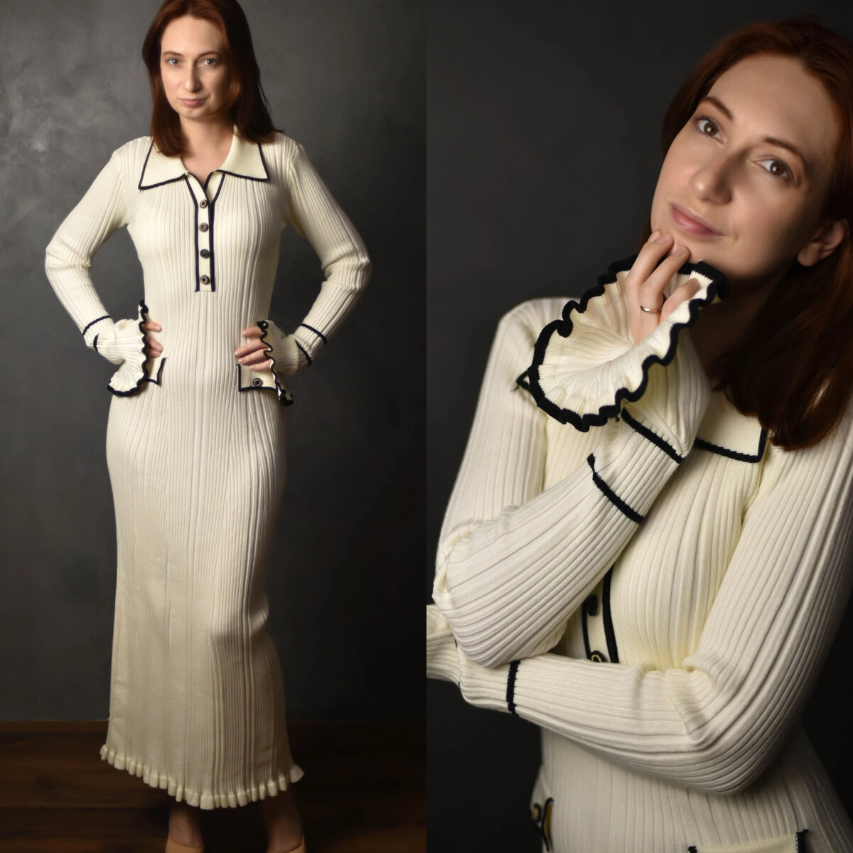 Стильное платье длины миди из плотного трикотажа с интересными деталями - один из самых женственных трендов этого зимнего сезона. 🛒 это платье я заказывала на Джум 🎬 видео примерки Платье выполнено вязкой "лапша", поэтому облегает фигуру. У него классический крой, но множество интересных деталей точно выделяет этот предмет гардероба из толпы😉 это и рукава и подол платья, клешеные книзу и создающие эффект колокольчика, и обрамление на рукавах, карманах, отложном воротнике и линии пуговиц. Сами пуговицы тоже акцентные, правда мне не повезло: золотого декоративного элемента на одной из пуговиц у меня нет. Не было его и в пакете с платьем, то есть отвалился он ещё до упаковки посылки. Продавцу жирный минус за то, что отправляет изначально бракованный товар. Видно отсутствие элемента сильно, так что мне придётся перешить все пуговицы 😞 В остальном качество отличное. Плотный, мягкий и тёплый трикотаж, аккуратные швы. Размерная сетка от S до L. На мои параметры 78х70х90см и р