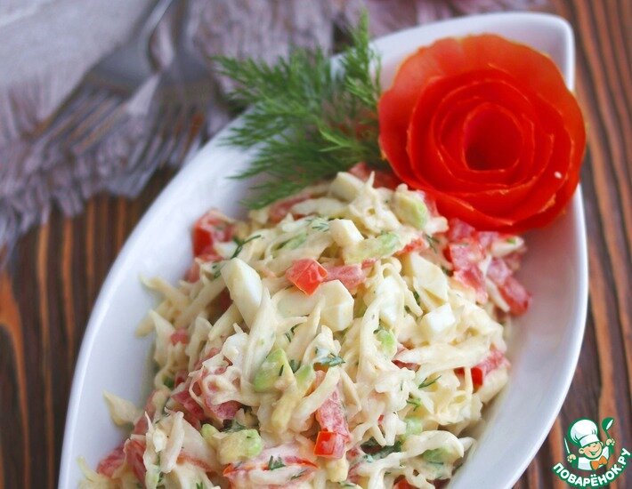 Простой и вкусный салат. Такой салат можно приготовить и в будний день и на праздничном столе он будет вполне уместен. Ингредиенты для «Салат с авокадо и помидорами»: Рецепт «Салат с авокадо и помидорами»: У авокадо удалить косточку, снять шкурку, нарезать авокадо мелкими кубиками. Помидор разрезать на две части, удалить лишнюю влагу и семена. Нарезать помидорные чашечки не крупными кубиками. Капусту нашинковать тонкой соломкой, поместить в пакет, слегка помассировать для придания мягкости. Яйца (2 шт.) отварить, нашинковать кубиками/брусочками. Нашинковать веточки свежего укропа. Все составляющие салата поместить в миску. Салат посолить по вкусу. Заправить салат майонезом. Приятного аппетита! Смотреть отзывы приготовивших на сайте >>>