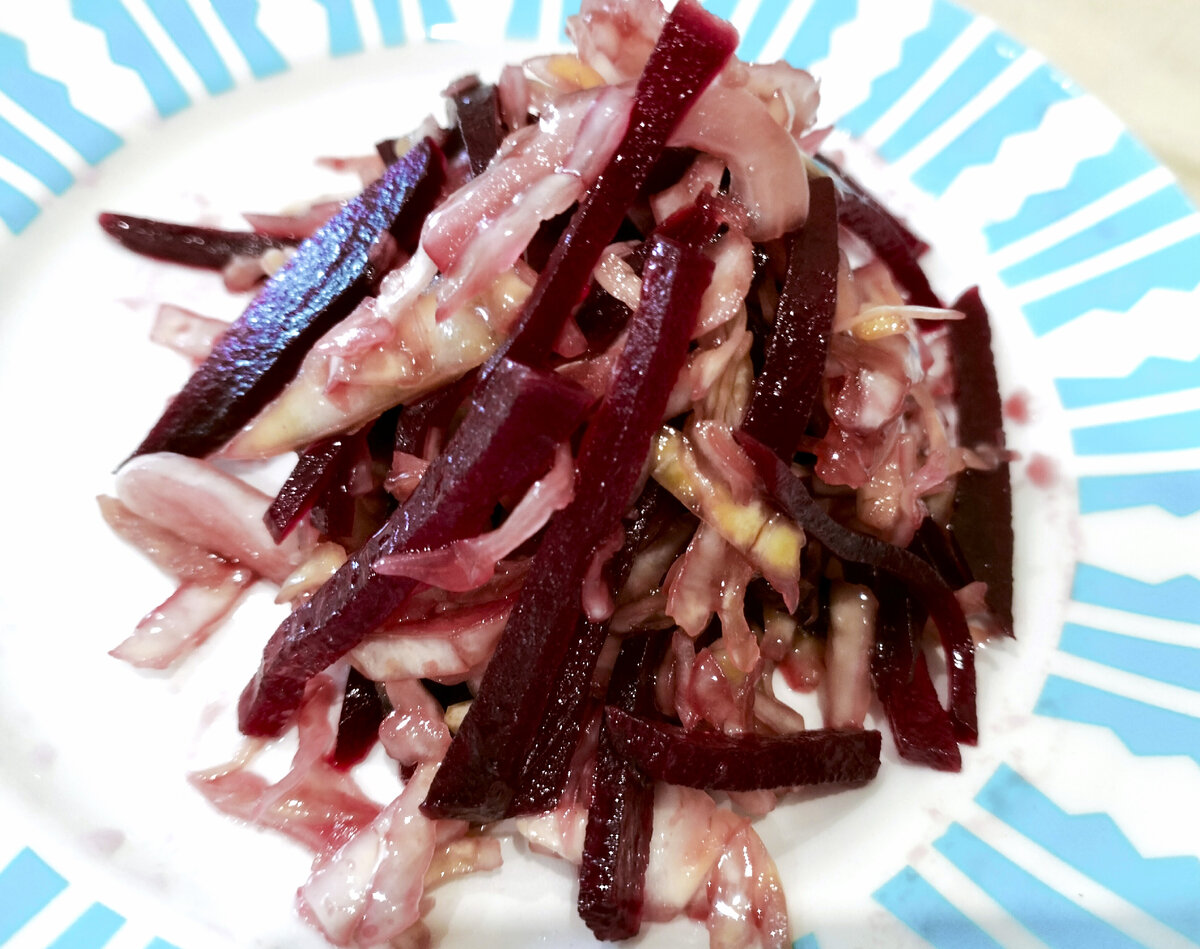 Сочный салат с белокочанной капустой и свеклой в пикантной заправке из соевого соуса и растительного масла
