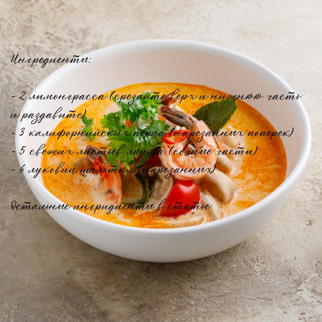 Добрый день, наши уважаемые гурманы и любители кухни стран Азии! Сегодня на нашем блоге о чудесах кулинарии мы хотели бы поделиться с вами рецептом уникального и абсолютно невероятно вкусного блюда - тайского супа "Том Ям". Если вы до сих пор еще не попробовали это блюдо, то вы реально многое упускаете! Ну а теперь надеемся что вы готовы погрузиться в этот экзотический мир вкусов и ароматов. Ингредиенты: - 2 лимонграсса (срезайте верх и нижнюю часть и раздавите) - 3 калифорнийских перца (нарезанных поперек) - 5 свежих листьев лайма (сочные части) - 6 луковиц шалотки (нарезанных) - 2 столовые ложки красного чили-пасты - 3 чайные ложки измельченного корня галангала - 3 листа кафир-лайма - 1 литр куриного бульона - 300 грамм кrevetki (удалите кишки) - 250 грамм шампиньонов (нарезанных) - 4 столовые ложки нам плаа (тушеный рыбный соус) - 3 столовые ложки соевого соуса - 2 столовые ложки сок лайма - свежая кинза (для украшения) Приготовление: 1. В большом кастрюльном горшочк