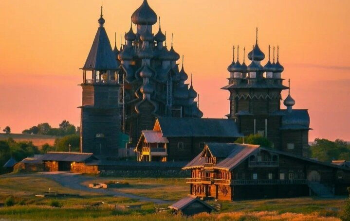 Над островами Онежского озера, - одного из самых больших в Европе, - возвышается заметная издалека группа из трёх построек, которые считаются вершиной деревянного зодчества. Остров Кижи - один из множества островов, разбросанных в Онежском озере в Карелии. На этом острове расположены две деревянные церкви 18 века и восьмиугольная, также деревянная, колокольня 19 века. Они стоят за общей оградой, образуя погост. Всего на северо-западе России сохранилось четыре подобных погоста, Кижи - самый знаменитый из них. Эти необычные сооружения, в которых плотники воплотили смелое архитектурное видение, навсегда сохранили древний способ решения храмового пространства и пребывают в гармонии с окружающим пейзажем. Погост Кижи получил статус памятника ЮНЕСКО в 1990 году. Практически вся Карелия покрыта густыми сосновыми лесами и озёрами, а лес - неисчерпаемый источник строительного материала. Первые российские поселенцы появились в этих краях в 12 веке, это были двинувшиеся на север выходцы из Новг