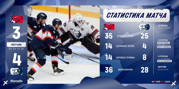 "Торпедо" уступило "Нефтехимику" в овертайме. Счет 3:4. Статистика матча: Броски: 59-54 ; Броски в створ: 35-25 ; Голы: 3-4 ; Вбрасывания: 36-28 ; Блокированные броски: 16-17 ; Силовые приемы: 14-8 ; Отборы: 5-6 ; Потери: 3-6 ; Перехваты: 6-7 ; Время в атаке: 12:33-09:55 ; Штраф: 14-4. В следующем матче нижегородское "Торпедо" играет с командой "Сочи" в среду 14 февраля.
