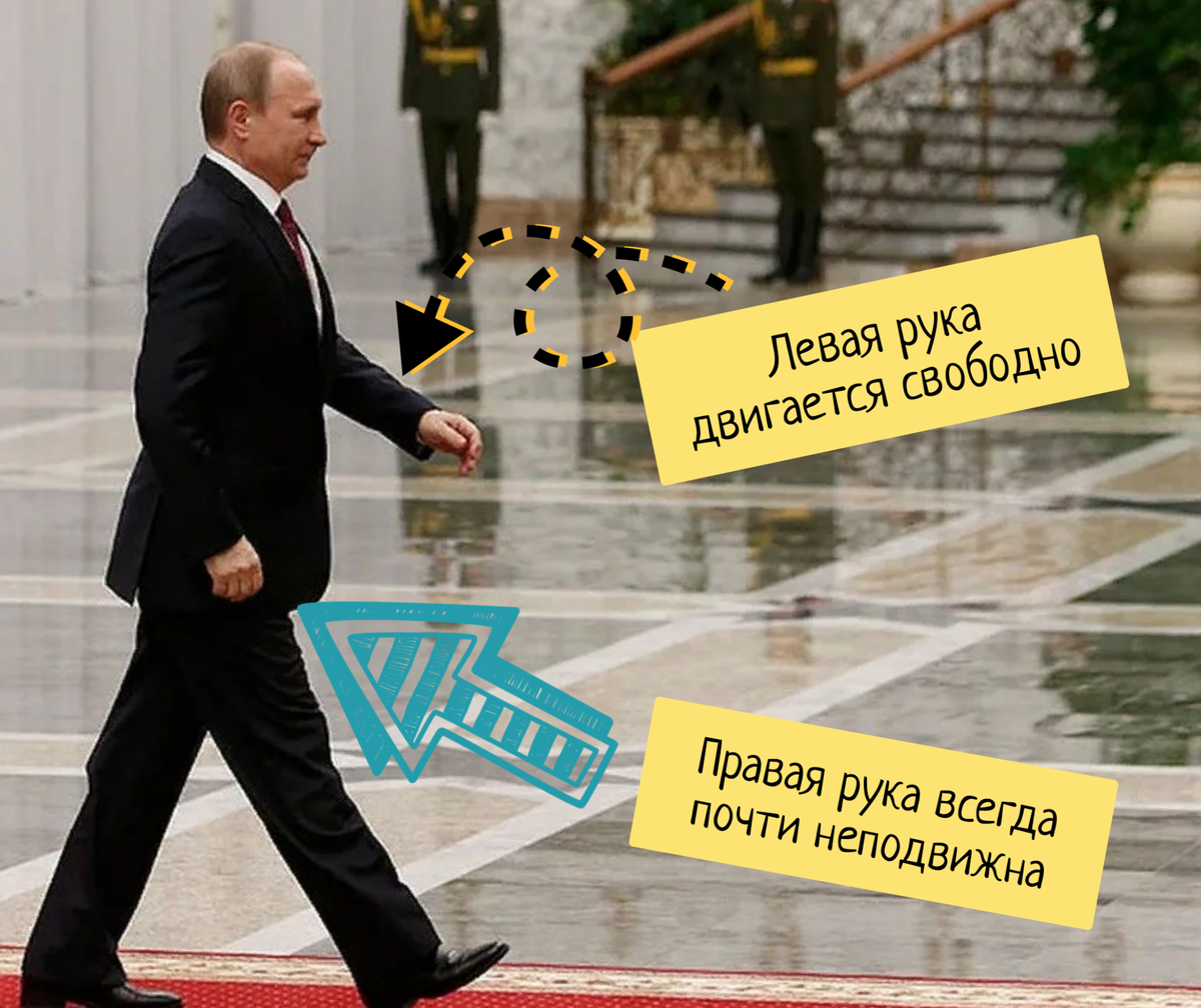 Если не обращали внимания за почти 25 лет, обратите. Когда Путин идёт, неважно куда и зачем, его правая рука практически неподвижна, а левая свободно двигается, причём в довольно большой амплитуде, как будто за двоих. Посмотрите любое видео, хотя бы вот этот небольшой фрагмент.