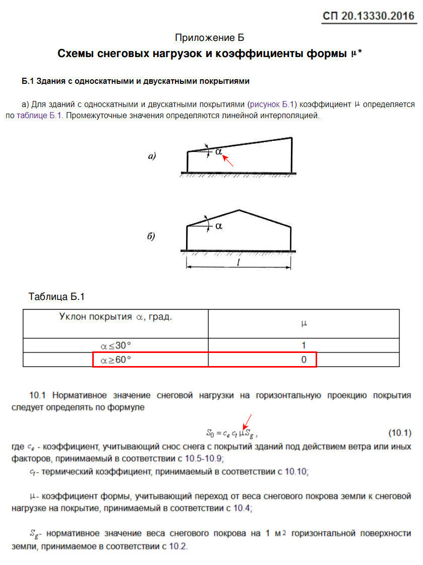 Согласно СП 20.13330.2016, для односкатных и двухскатных кровель с уклоном более 60° снеговая нагрузка не учитывается. Иной угол указан для светопрозрачных конструкций (СПК). СП 426.1325800.2020: