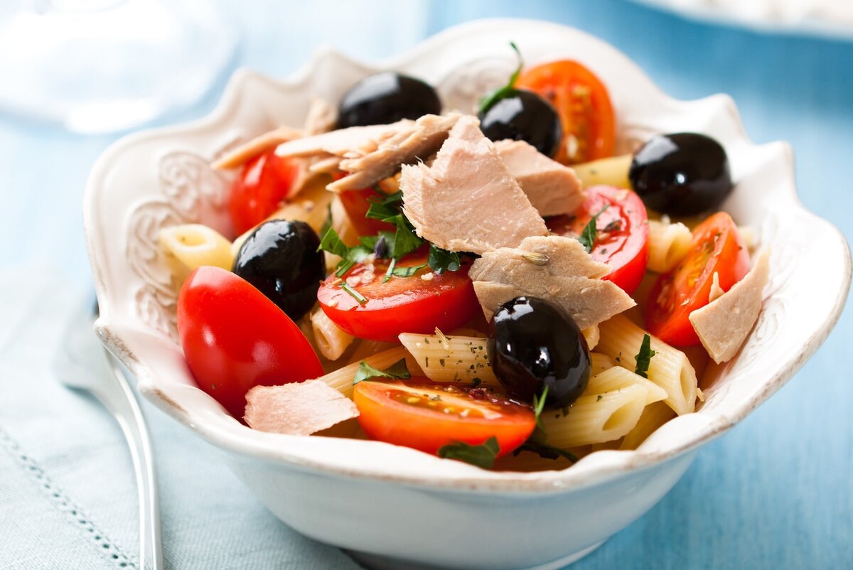 Чаще всего пасту в холодном виде можно встретить в Италии. Местные жители любят готовить ее с различными добавками на обед в жаркие дни. Предлагаем универсальное сочетание продуктов: консервированный тунец, паста и оливки, а также овощи.