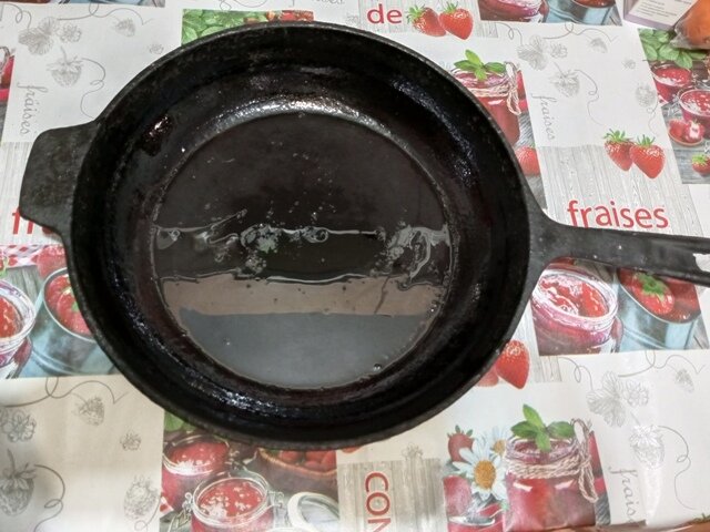 Я обычно покупаю стейки зубатки синей. Когда я ее раньше готовила, она все время пыталась раствориться на моей сковороде. В итоге я получала много бульона и мало рыбы. Я нашла способ готовить ее так, чтобы она не растворялась на сковороде. 1. Для приготовления этого блюда мне понадобится большая и глубокая сковорода. У меня она чугунная. Смазываю ее растительным маслом. 2. Чищу картошку столько, чтобы хватило на половину сковороды. 3. Картофель нарезаю тонкими кружочками, солю, перчу, добавляю приправы. 4. Перемешиваю. 5. Рыбные стейки размораживаю и мою. 6. Выкладываю их на картошку. Слегка подсаливаю. 7. Луковицу большую чищу, мою и нарезаю кружочками толщиной 0,5 см. 8. Кладу лук поверх рыбы и тоже слегка присаливаю. 9. Еще мне понадобится фольга толстая и широкая. У меня в данном случае шириной 44 см. 10. Сковороду со всем ее содержимым накрываю фольгой. 11. Ставлю сковороду в разогретую духовку на 45-50 минут. 12. Через отведенное время достаю сковороду из духовки. Снимаю фольгу.