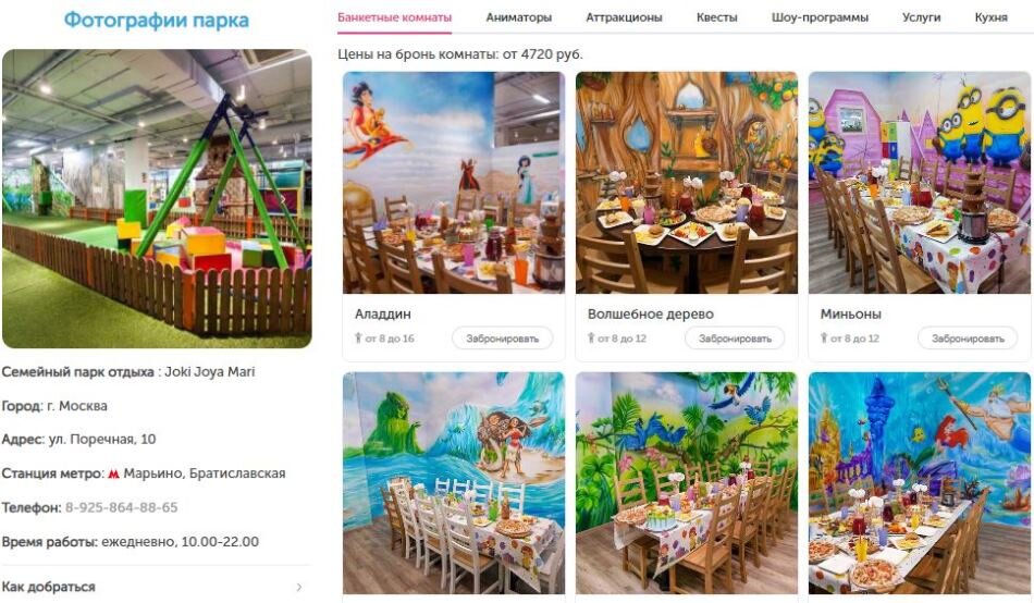 Банкетные залы развлекательного центра посвящены детским праздникам. Посетителям центра предлагается запись на предстоящие мероприятие, бронирование игровой комнаты, обзор фото каталогов, меню кафе. На территории семейных парков работают лучшие фотографы, к услугам пользователей профессиональные фотосессии, фото-сувениры (магниты, рамки). По пятницам, выходным также доступен аквагрим. В блоге создатель регулярно публикует статьи, истории развития развлекательного центра.