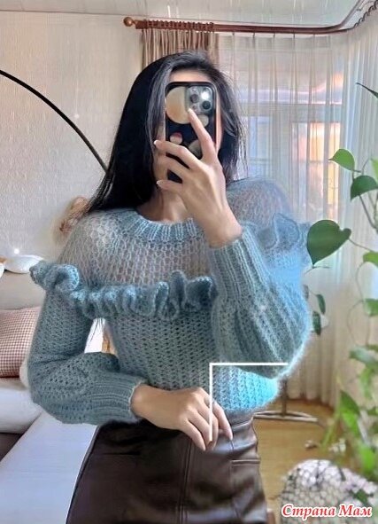 Выкройка Обхват груди 86 см. Обхват талии56 см. Длина 42 см. Длина рукавов 44 см. Пряжа мохер с шелковым блеском 200 гр. Крючок 3.5. Выкройка Джемпер вяжется от горловины. Нужно набрать 54 петли замкнуть в кольцо и вязать делая прибавки с первого ряда. На схема места прибавок обозначаются красным цветом. Схема рукавов Схема рюши (сверху) и обвязок декольте и низа джемпера. Подпишись 🧶 Бесплатные МК по вязанию крючком и спицами . Схемы скачать можно здесь 👉