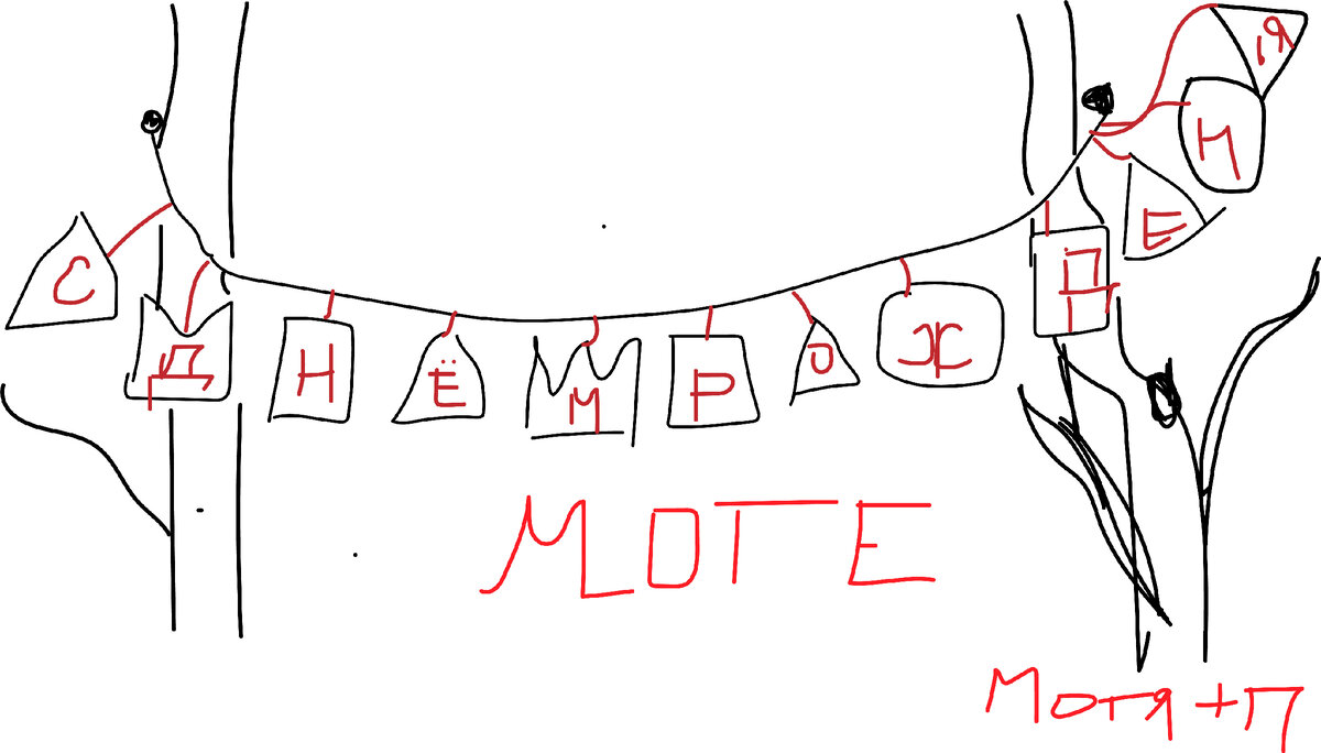 Моть, что будем рисовать сегодня? День рожденья, пап. Хорошо, а чей день рожденья? День рожденья Моте. Моте?, ну хорошо... ...получилась растяжка на двух деревьях.