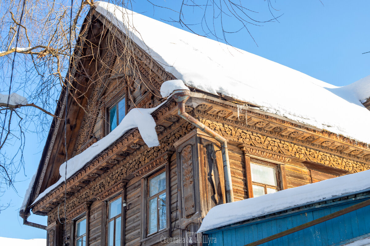 Кто такой Дубовкин, владевший в XIX веке в нижегородской деревне Кузнечихе двухэтажным домом с остроконечной крышей и богатой глухой резьбой - рунет не знает. Номер в ЕГРН, дата постройки - 1877 год, и статус - памятник федерального значения. Вот, собственно, и всё. И ворох восторженных отзывов от людей, видевших его по фотографиям и вживую. Последних почему-то немного, вот и мы присоединились к их числу. Солнечный зимний день - лучшее время для осмотра этого невероятного деревянного дома с возвышающейся над остальным частным сектором двускатной остроконечной крышей. В более тёплое время года великолепие резьбы неминуемо скроет листва старой ивы, посаженной аккуратно напротив фасада - то ли для отвода воды, то ли - досужих глаз. Пышные растительные узоры по углам фронтона охраняют львы с высунутыми языками, изящно изогнувшие головы за спины. Светёлочное окно затейливо оформлено деревянными пилястрами и завитушками. Дата на доме подтверждает, что построен он действительно в 1877 году. Г