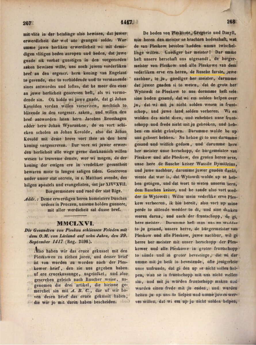 1417 г. сентября 29. — Договорная грамота Пскова с Ливонским орденом о десятилетнем мире. Грамота опубликована в LUB, V, № 2166 (стр.267-270), перевод в ГВНП № 334 (стр. 318-321). В тексте грамоты 1417 года псковские послы от лица всего Пскова называют царем (keiser) великого князя владимирского и московского Василия Дмитриевича, а весь Псков его отчиной: «alle Pleskow, des groten heren erve, unse here de Rusche keiser Wassile Dymittrius» (и весь Псков, отчина великого князя, нашего господина русского царя Василия Димитриевича). Публикация в Liv-, Est- und Curlandisches Urkundenbuch nebst Regesten. Herausgegeben von Dr. Friedrich Georg von Bunge. Band V, Heft 1, Riga: im Verlage von Nikolai Kymmel, 1862, № 2166 (стр.267-270) (LUB V). Публикация: Грамоты Великого Новгорода и Пскова, под ред. С. Н. Валка. М.-Л., 1949. № 334 (стр. 318-321) (ГВНП). ИСТОЧНИКИ и ДОПОЛНИТЕЛЬНЫЕ МАТЕРИАЛЫ: