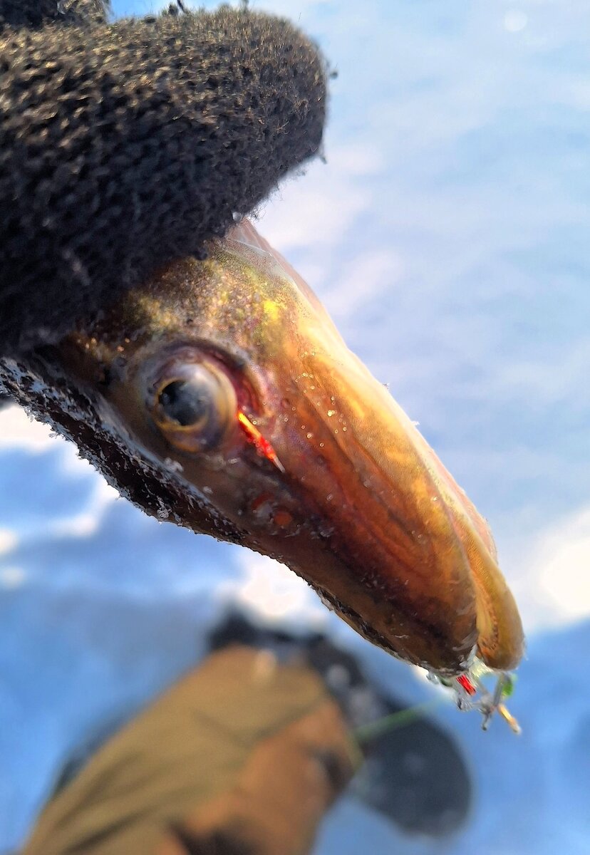 10.02.2024 г По приезду на место дул очень сильный ветер, который переметал все тропы. Ловили на жерлицы. Но без рыбы мы домой не уехали. Я поймала щучку на балансир, которая заглотила балансир так, что передний крючок вышел на ружу через глаз. А минут через 20 из этой же лунки, на этот же балансир Андрей поймал хорошую щучку. Это его первая пойманая щука. Итог этой рыбали. У мужа 3 подъёма : 1 сход, 1 взял и 1 холостой. У меня 7 подъёмом: 2 схода и остальные холостые и одна щучка на балансир. У Андрея естественно первая зубастая. Озеро Чебаркуль. Рыбак Елена Балдина