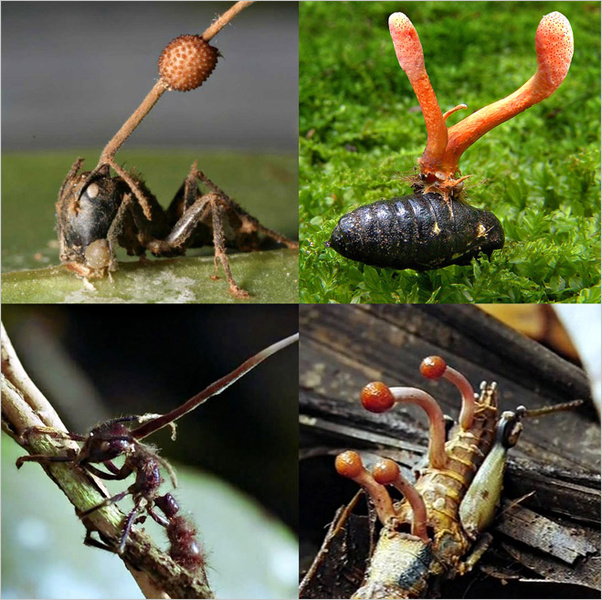 Некоторые виды взаимодействия грибов с другими существами могут вызвать страх. Например, очень нехорошие вещи вытворяет с муравьями-древоточцами гриб кордицепс однобокий. Вообще-то муравьи с грибами давние друзья. Некоторые виды муравьев разводят грибные плантации на нижних этажах своих муравейников. Они приносят кусочки грибницы в увлажненный субстрат, удобряют его, химически обрабатывают от вредителей, а взамен немножко подъедают грибы, выросшие на грибнице, — сотрудничество взаимовыгоднейшее. Но кордицепс однобокий действует иначе. Спора гриба попадает по воздуху в мозг муравья, пристраивается не нервном пучке и принимается посылать муравью биохимические сигналы, управляя его поведением. Муравей, превращенный в зомби, бросает все свои дела, лезет на высокое дерево, находит там крепкий лист, вцепляется зубами в центральную его жилку и висит, пока не умрет. И вот из начинающего разлагаться трупика, потихоньку им питаясь, уже растет длинная палочка с шишечкой на конце — это и есть корд