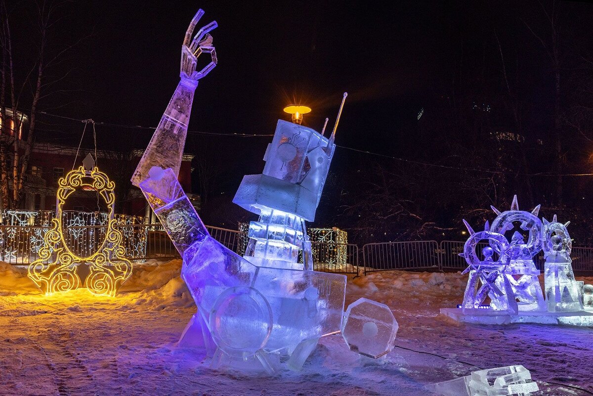 Мастера создали более трех десятков скульптур из снега и льда. С 6 по 10 февраля в Петрозаводске прошел международный зимний фестиваль «Гиперборея». Главным событием большого зимнего праздника стал конкурс ледовых и снежных скульптур. В этом году темой конкурса стали «Отечества Великие умы». В 2024 году Российская академия наук празднует 300-летие. Мастерам предстоит украсить Онежскую набережную ледовыми и снежными скульптурами, представляющими известных российских ученых разных эпох, научные открытия и изобретения. Петрозаводский фотограф Илья Тимин опубликовал большой фоторепортаж с ледовыми и снежными скульптурами – с подсветкой они смотрятся особенно эффектно. Интересным решением стала загоревшаяся вечером лампочка у робота со скульптуры «Эврика». Многие зрители отметили эту работы в числе наиболее интересных. В итоге скульптура заняла третьей место – достойный результат. Как мы писали ранее, в номинации «Ледовая скульптура» победила команда из трех городов – Сергей Поташев, Нико