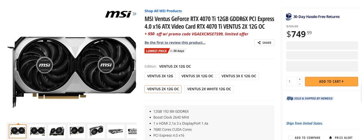 NVIDIA GeForce RTX 4070 Ti теперь можно найти по цене $699, что означает, что она продается по той же цене, что и видеокарта AMD Radeon RX 7900 XT. GeForce RTX 4070 Ti определенно отстает от Radeon RX 7900 XT и имеет меньше VRAM (12 ГБ против 20 ГБ), а более быстрая GeForce RTX 4070 Ti SUPER продается примерно на 100 долларов дороже. Radeon RX 7900 XT быстрее примерно на 6-11 процентов, в зависимости от игры и разрешения. Карта GeForce RTX 4070 Ti от MSI - это модель Ventus 2X OC, представленная на Newegg.com по цене $749,99 с промокодом на скидку $50. Имейте в виду, что это версия с двумя вентиляторами от MSI, и мы уверены, что увидим аналогичные акции от других партнеров NVIDIA AIC.