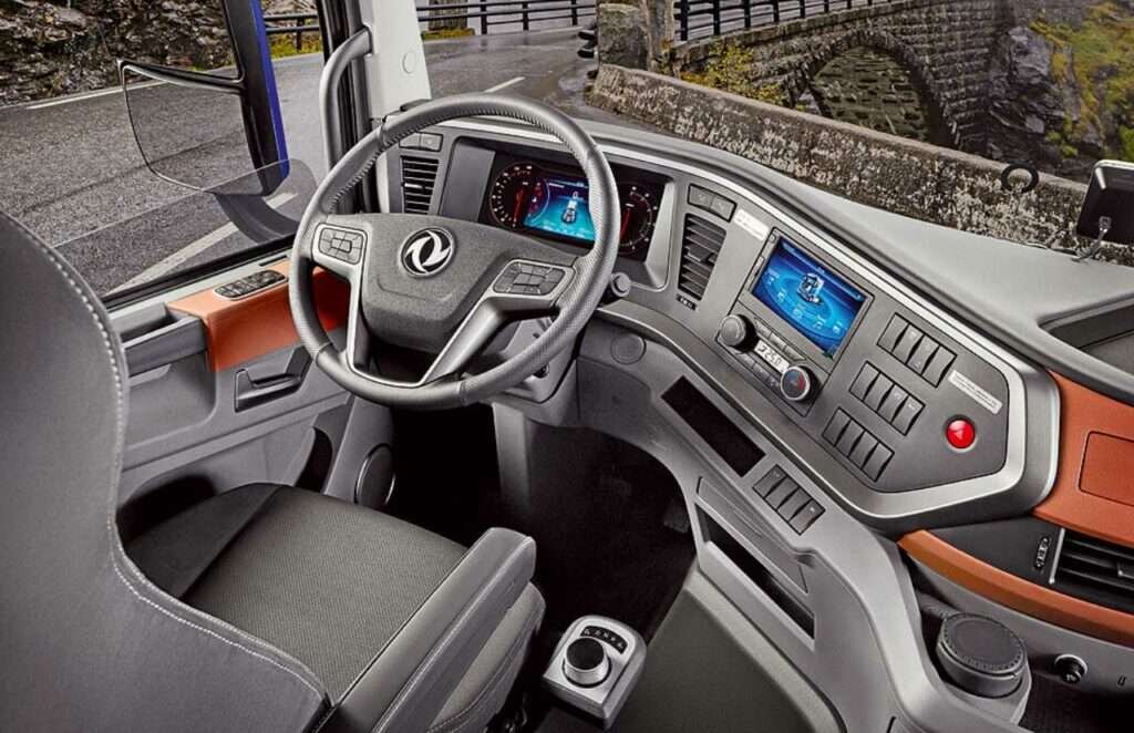 У тягача Dongfeng GX 4х2, видимо, применяется каркас кабины Volvo FH шестого поколения, то есть той, что встала на конвейер в Гетеборге в 2013 году. Чтобы понять, насколько эта кабина «вольвовская», надо поставить Volvo FH и Dongfeng GX рядом. А можно просто замерить ее изнутри рулеткой. У Dongfeng GX такие размеры: ширина кабины по стеклам дверей – 232 см, длина от лобового стекла до задней стенки – 212 см, высота от пола до потолка над головой водителя – 201 см. Тоннель двигателя возвышается на 12 см. Сравнивая эти размеры с современным Volvo FН, легко заметить – они очень близки. Даже спустя 10 лет после премьеры FH образца 2013 года эта кабина остается одной из лучших в мире для магистрального грузовика. Лучшей по объему, по безопасности при столкновениях и ДТП, по продуманности интерьера.