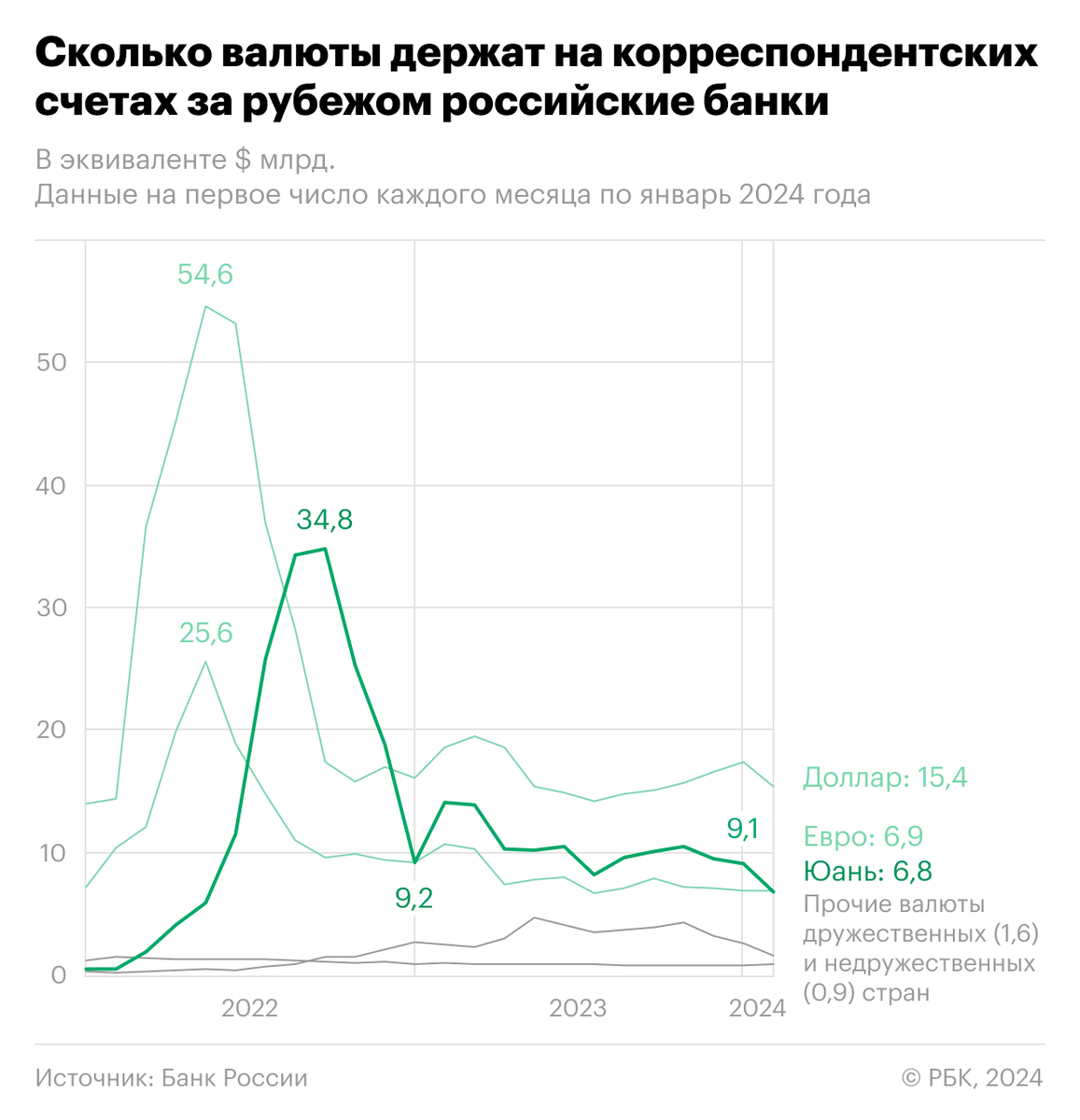 Российские банки на 1 января 2024 года держали на корреспондентских счетах за рубежом остатки в юанях на $6,8 млрд, следует из статистики Банка России, которую изучил РБК. Это минимальный объем с июня 2022 года (тогда было $5,9 млрд). За декабрь валюта на юаневых ностро-счетах сократилась на 25,7%, или на $2,3 млрд.