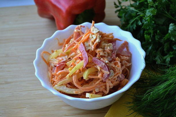 Копченая курица, корейская морковь и сочный болгарский перец в этом салате создают неповторимое сочетание вкусов и текстур. Аромат дыма от копченой курицы дополняется свежестью овощей, а майонезное покрывало придает салату нежность и кремовость.