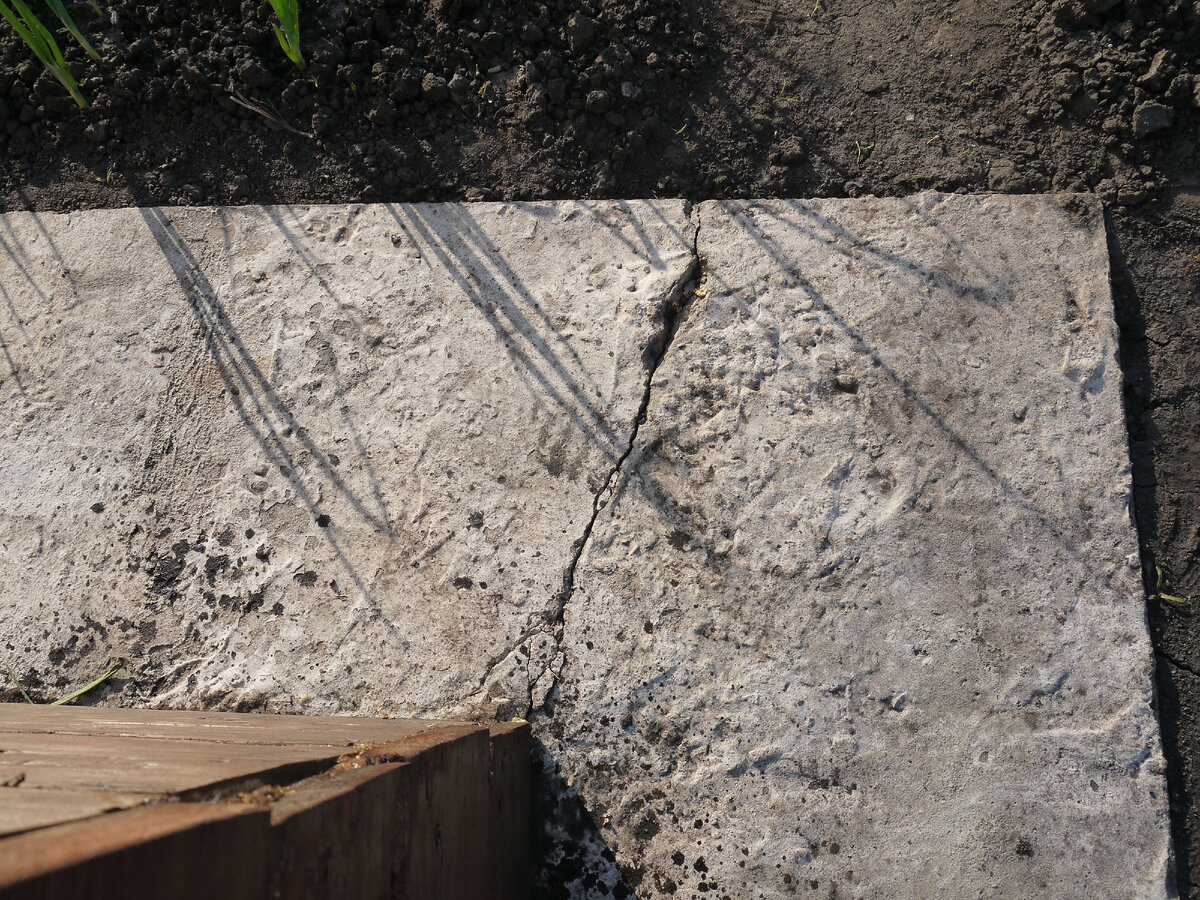 Часто отмостки вокруг здания делают из бетона – это самый простой и дешёвый вариант. Но дешево иногда не значит качественно. Когда грунт, на который заливают смесь из воды, песка и цемента, недостаточно утрамбован, через некоторое время в ленте появляются трещины. Чаще всего отмостка разрушается по углам, поэтому для предотвращения трещин во время заливки желательно туда закладывать прутья арматуры. Если это оставить без внимания, то вода, попадающая в щель, в холодное время года замерзает, превращаясь в лёд, который разрушает отмостку ещё больше. Возможно, из неё начнут расти сорняки или деревья, например, американский клён, дерево-сорняк, которое растёт везде, куда попадают его семена. Через некоторое время его корни полностью разобьют отмостку. Поэтому такие трещины надо заделывать как можно быстрее, если, конечно, вас это беспокоит. Судя по огромному количеству разрушенных отмосток возле деревенских домов, их жителей такие проблемы волнуют мало. Итак, в отмостке появилась трещина.