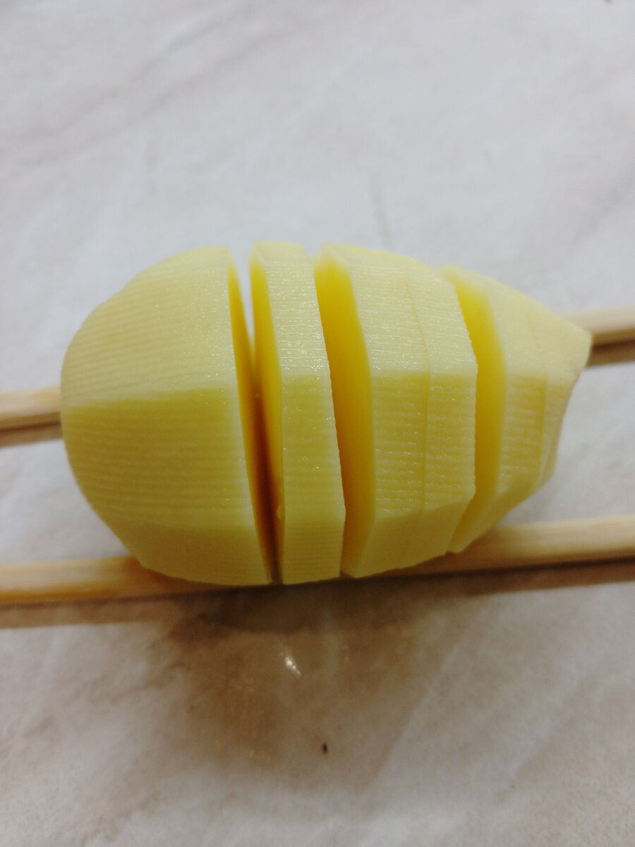 Простой, вкусный и красивый гарнир. Картошку чистим, нарезаем на дольки примерно по 5 мм. толщиной, но не прорезая до конца. Это удобно сделать если подложить под картофелену палочки для суши или чайные ложечки. Они не позволят прорезать картофель насквозь. Далее добавляем в картофель, соль, черный молотый перец, сухой чеснок, сладкую паприку и не много растительного масла. Хорошо натираем этой смесью картофель. Хорошо промазываем каждое отделение нашей "гармошки". Оставляем минут на 30. Когда картошка постояла и помариновплась нарезаем мороженое сало так тонко как сможете и вкладываем не большой кусочек в каждое отделение картошки. Ставим в духовку минут на 40-50 при 180 градусах. Время может понадобитьмя чуть больше. Это зависит от вашей духовки и от величины картофеля. За 5 минут до готовности можно посыпать картофель сыром. Приятного аппетита!