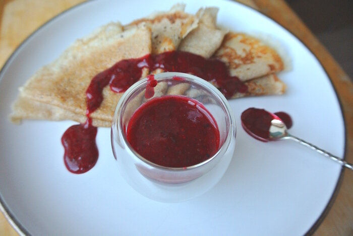 Я очень люблю блины. Ем их практически каждую неделю, и всем рекомендую. Это такое блюдо, которое не может надоесть, так как существует огромное разнообразие добавок к нему, на любой вкус. Вчера, к примеру, я ел блины с "ненастоящим" вареньем (так как оно не подвергается тепловой обработке). Название не совсем корректное, но более-менее отображает концепцию данного соуса. Рецепт навеян так называемыми "мятыми ягодами" из старых кулинарных книг. Только я, дабы ускорить процесс, не мял ягоды вручную, а использовал средства механизации, выпущенные сумеречным китайским гением. Рецепт простейший, но при этом очень вкусный. К делу. 0.5 Литра свежемороженой клюквы (берите дикорастущую, так как садовая не обладает таким ярким вкусом) за ночь разморозьте в холодильнике, затем добавьте в ягоды около 1/3 чайной ложки (без горки) молотой корицы. Следом добавляйте свежевыжатый сок из половины апельсина. Кто любит послаще, тот может добавить столовую ложку мёда. Затем все ингредиенты измельчайте бле