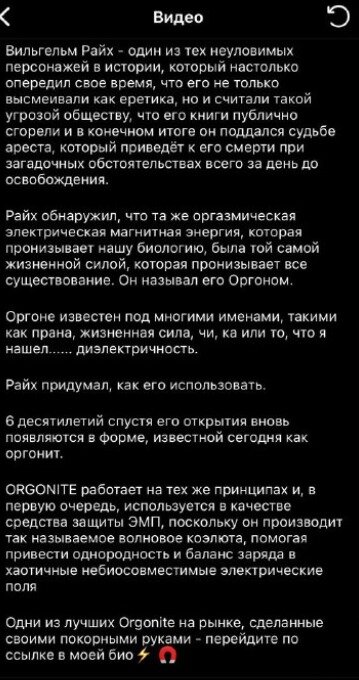 «Оргон известен под многими названиями, например, прана, жизненная сила, ци, ка или то, что я называю диэлектриком. Райх придумал, как это использовать», — говорится в посте.