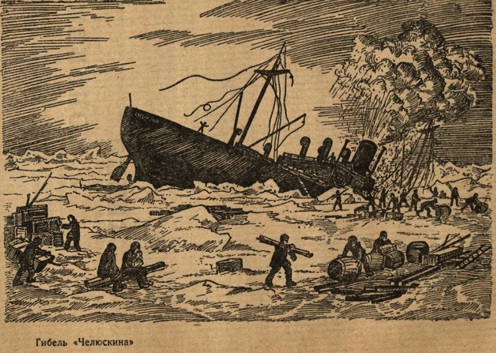 « 13 февраля в 15 часов 30 минут в 155 милях от мыса Северного и в 144 милях от мыса Уэллса «Челюскин» затонул, раздавленный сжатием льдов».