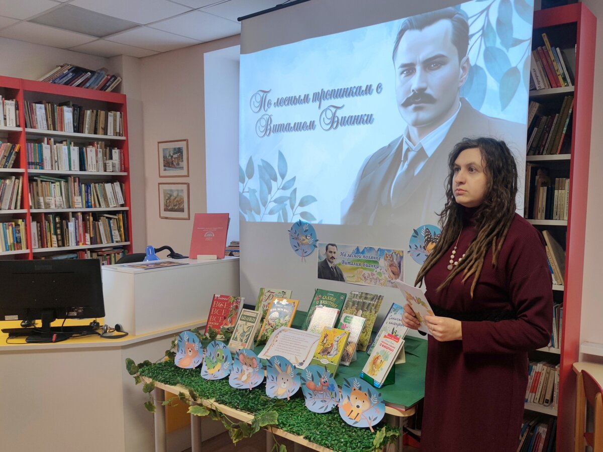 «Вся жизнь — сказка. К чему ни начнёшь прислушиваться — за самым обыкновенным, даже скучным на первый взгляд явлением скрываются удивительные вещи. Начнёшь разбираться, а там — полно неизвестного: тёмные дебри маленьких и больших тайн.» Виталий Бианки Одно из самых удивительных свойств книг Виталия Валентиновича Бианки состоит в том, что они не только расширяют кругозор, но и учат смотреть, видеть и понимать. Они уводят за собой в лес, в поле, даже на болото. И, если подарить ребёнку, пусть маленькое, лесное путешествие, то это сможет стать самым главным открытием для него. Такое путешествие «По лесным тропинкам с Виталием Бианки» прошло в Детско-юношеской библиотеке 9 февраля для учащихся 1 класса школы №2117. Юные гости познакомились с жизнью и творчеством известного детского писателя-натуралиста, тонкого знатока родной природы. Ведущая Анастасия Самаркина рассказала ребятам интересные факты из биографии автора: фамилия писателю досталась от его прадеда, которая изначально была псе