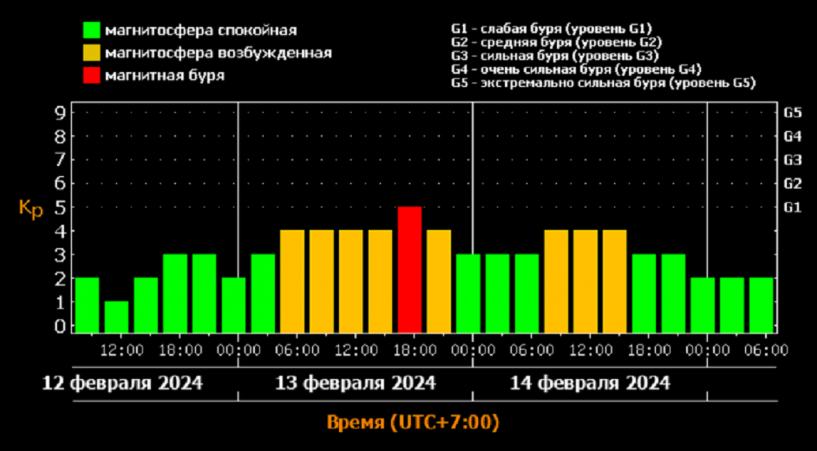 В Новосибирске ожидается магнитная буря вечером 13 февраля. Об этом сообщили в Лаборатории солнечной астрономии ИКИ и ИСЗФ. Магнитосфера начнёт возбуждаться 13 февраля в шесть утра. Пиковое значение придётся на 18 часов вечера этой же даты. К 12 ночи магнитосфера придёт в спокойное состояние. На сайте Лаборатории солнечной астрономии ИКИ и ИСЗФ предстоящую бурю оценивают в уровень G1 (слабая буря). Фото: скриншот с сайта Лаборатории солнечной астрономии ИКИ и ИСЗФ Днём 14 февраля магнитосфера вновь придёт в возбуждённое состояние, но магнитной бури не ожидается. К вечеру этой даты магнитосфера должна прийти в спокойное состояние.