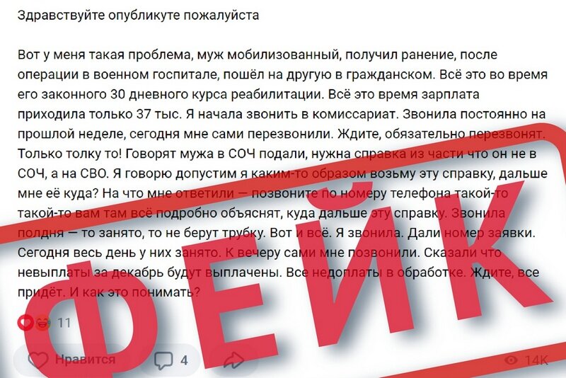Такой же текст циркулирует в пабликах других регионов В социальных сетях Зауралья распространяется анонимное сообщение о том, что мобилизованный не получил положенные выплаты. Об этом сообщает Центр управления регионом Курганской области. «Данное сообщение имеет признаки фейка. ЦУР Курганской области зафиксировал распространение точно такого же текста в пабликах других регионов – 214 одинаковых публикаций по всей стране. Причем текст в них повторяется слово в слово, и даже сохраняются одни и те же опечатки», — отмечается в информации ЦУР. Там призывают граждан быть бдительными, доверять только официальным источникам и не распространять непроверенную информацию. Напомним, что в последнее время в Зауралье циркулировали фейки о карантине в курганских школах и о планах нападения на образовательные учреждения.