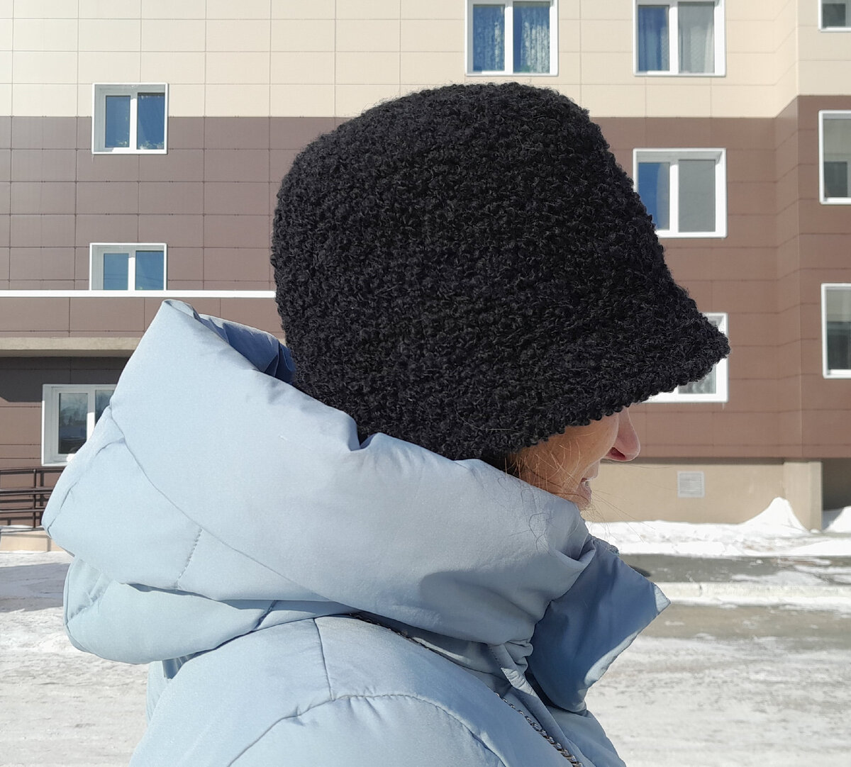 Это первый мой опыт вязания из буклированной пряжи. Давно я на эту пряжу заглядывалась, и вот свершилось: купила несколько моточков и решила связать из нее головной убор. Фасон я выбрала самый простой — панама, и самый простой узор — столбики без накида. Пряжа сама по себе выглядит очень эффектно, ажурные узоры из нее просто не будут видны. Легкие пути не для меня: выбрала буклированную пряжу, да еще и черного цвета. Пряжа производителя Laines du Nord Teddy B, состав 75 % альпака, 10 % mulesing free шерсть, 15 % полиамид, длина нити 120 м, вес 50 г. Эта пряжа состоит из множества завитков, изделия из нее имитируют мех, очень похожи на каракуль. Рекомендуется при вязании из этой пряжи использовать инструменты большого размера для получения рыхлого полотна. Кроме того при роспуске этой пряжи могут возникнуть сложности. Но так как мне нужна была панама поплотней, я к буклированной пряже добавила пряжу Matera от Laines du Nord. И сразу оговорюсь, при добавлении второй нити распускать ста