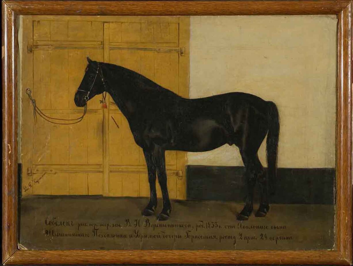 На картине художника Д. Харламова, недавно поступившей в экспозицию из запасника и скромно расположившейся в «Рысистом зале» музея коневодства, изображен 15-летний вороной Соболёк, получавший в свое время эпитеты «русский богатырь» и «тридцативерстный рысак».