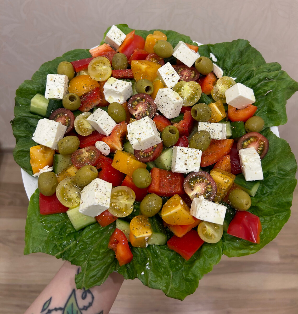 - Сверху добавляем оливки, маслины, нарезанный кубиком сыр фета.
