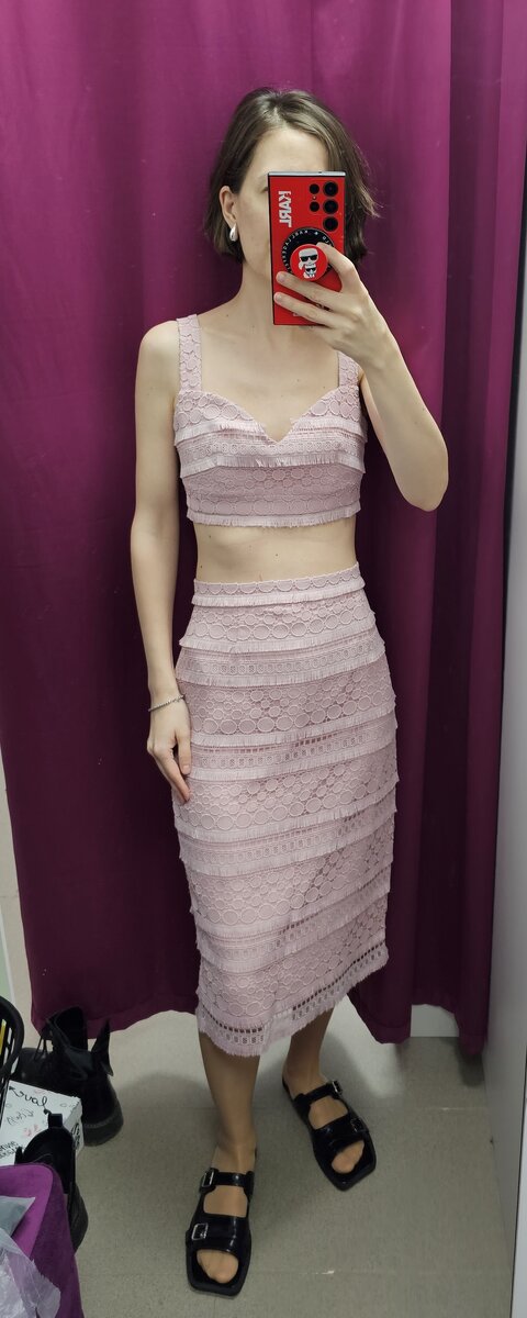 У меня уже весной пахнет, и настроение какое-то романтическое. Вот и захотелось мне чего- то такого девочкового. И решила я пройтись по кружевным вещам, благо они сейчас в моде (не всякие, конечно, тут тоже нюансы знать надо). В корзину на ВБ закинула костюм цвета пыльной розы и черную юбку. Как они выглядят в жизни - покажу и все о них расскажу. Костюм из кроп- топа и юбки миди Очень красивый, но есть нюанс: чтобы топ сидел красиво нужен не первый, как у меня размер гpyди, даже в маленьком 42 размере, а не меньше двойки, но не больше тройки. Как в бОльших размерах - не знаю. Юбка при этом села идеально. Она совсем чуть свободная, и на размер меньше костюм заказывать не вариант - юбка будет прям в облипку. При этом не факт, что топ не будет свободен. А жаль, костюм и красивый, и качественный. Швы аккуратные, подкладка похожа на хлопок (в карточке товара ничего об этом не сказано, а ярлык я забыла почитать) Юбка макси Я в Зарине пару месяцев назад примеряла кружевные брюки. Они мне понр