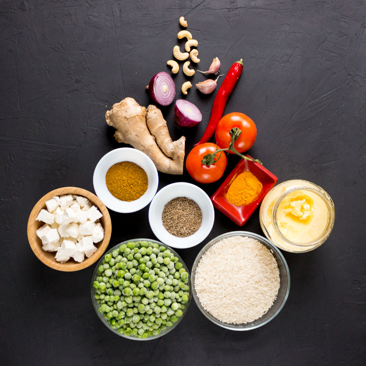 Рецепт покорил мое сердце 2 года назад в Индии. Теперь это блюдо частый гость на обеде или ужине. Несмотря на количество ингредиентов, готовится достаточно легко, 40-60 минут. А по питательности и вкусовым ощущениям превосходит многие блюда. Ингредиенты: Специи: Рис и Панир — его количество на ваше усмотрение. Я люблю поменьше риса и побольше сыра, например. Основная специя индийской кухни — Гарам масала. Ее легко можно купить, но если хочется заморочиться, то можно и сделать самим (рецепт есть в интернете), купив все специи немного прожарить и перемолоть. Рецепт 1. Панир режем кубиками и обжариваем на масле Гхи. 2. В блендере с небольшим количеством воды перемалываем: чеснок, имбирь, лук, чили перец. 3. Перемалываем кешью. Одновременно ставим вариться горох. 4. На горячую сковороду в масло высыпаем специи (зиру 0,5ст л — она еще нужна для риса и гарам масала только 1ч л) и кешью. Немного прожариваем, чтобы специи дали запах. 5. Добавляем нашу смесь-пюре из имбиря, чеснока, лука и перц