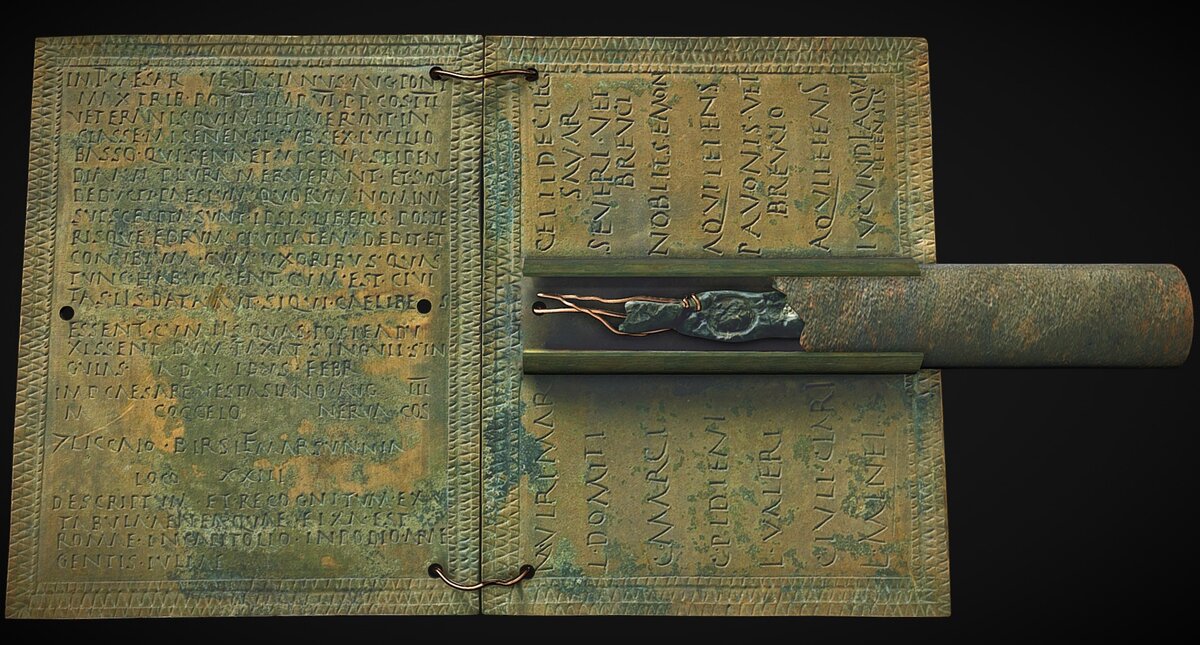 Сохранность диплома уникальна. Две бронзовые таблички скреплены между собой: в них имеются дырочки, через которые продета бронзовая проволока. На табличке справа выгравированы имена семи свидетелей. Свидетели ставили свои подписи с помощью перстней-печаток. Так вот, в середине второй таблички находится отсек с выдвижной крышкой, в котором хранятся печати пяти свидетелей. И печати тоже целы. Это единственная находка с сохранившимися печатями.