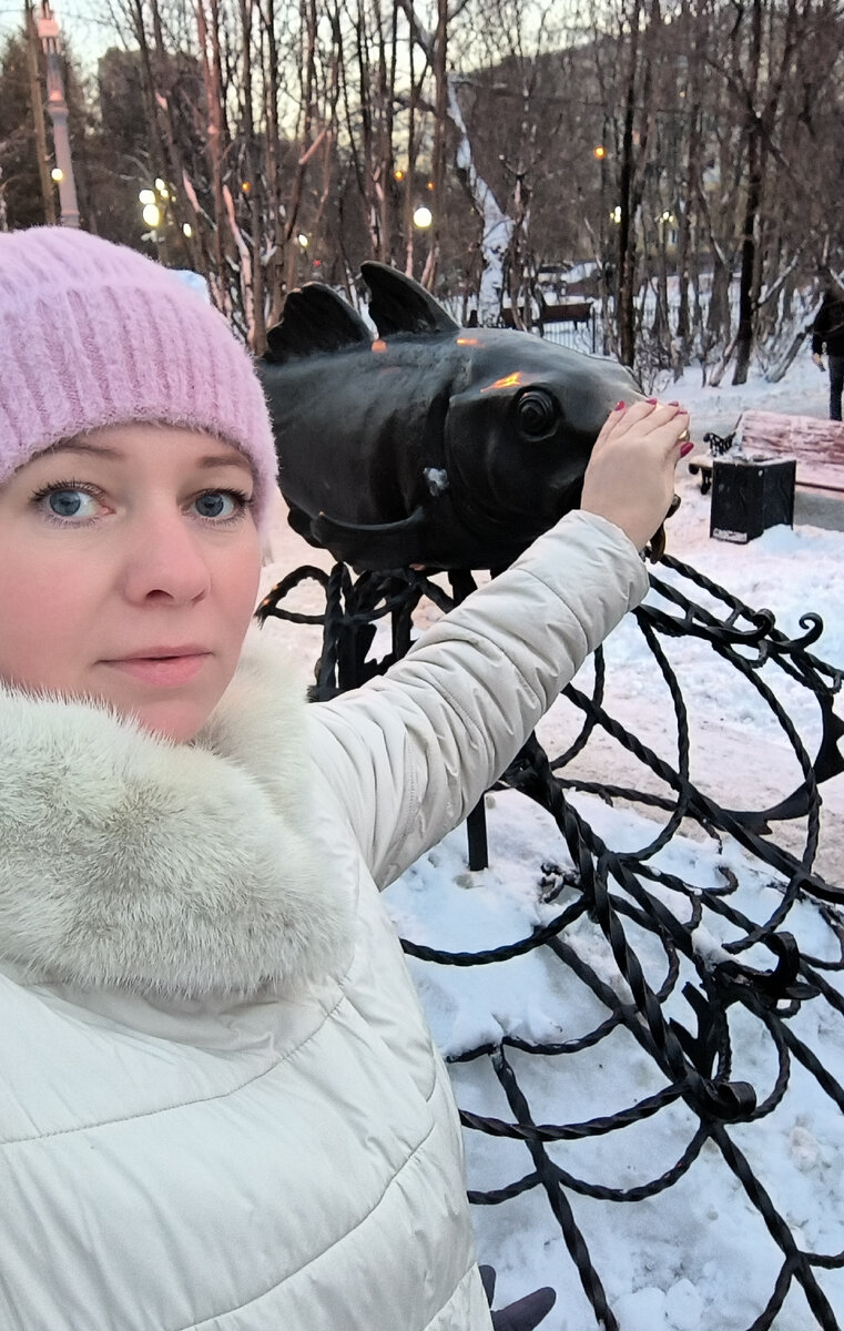 Тематическая неделя. Мурманск. Расскажу про всё, что хотела, но не успела во время недавней поездки. Усаживайтесь поудобнее. Мурманск самый большой город за полярным кругом. Ему 107 лет. Название означает "Город на Мурмане". Слово Мурман произошло от скандинавского norman и означает "северный человек". Город основал Николай Романов и в первые годы он назывался Романов-на-Мурмане. Экскурсовод сказала: "Вы живёте в самом центре, центрее уже некуда. Отсюда лучами расходятся пять разных улиц". Площадь пяти углов была задумана основателем в честь его пятерых детей. Треска - царица северных морей. Деликатесом считаются печень трески, язык и ещё щечки. Со мной на фото треска среднего размера, но может вырасти и больше. Если загадать желание и потереть ей нос, то говорят, что сбудется. Отовсюду открывается вид на Кольский залив. Чтобы посмотреть Баренцево море надо ехать в Териберку. Когда температура воздуха опускается до -12-13 градусов, то город погружается в туман. Это тёплый